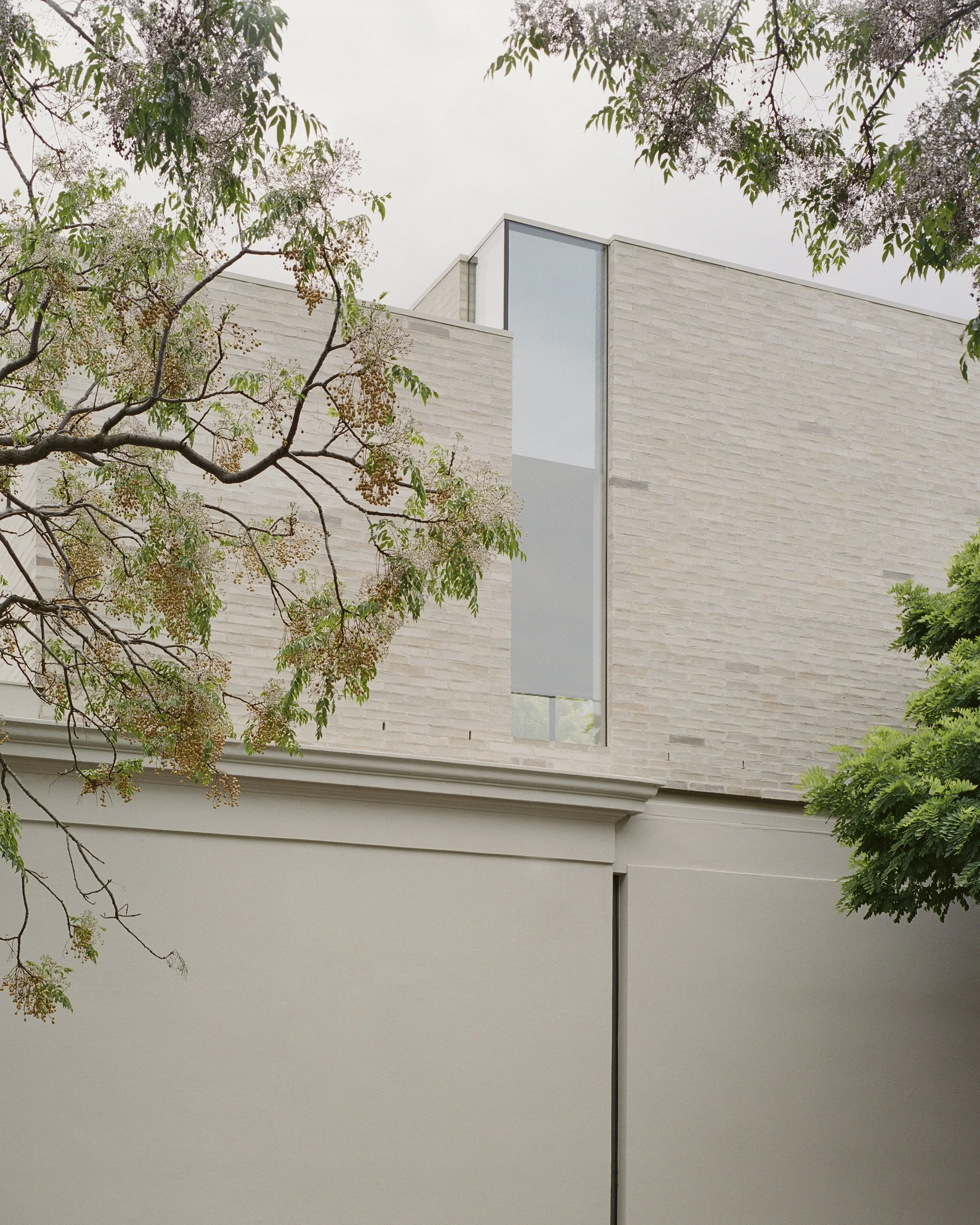 The retrained asymmetrical façade, contrasting with the equally retained yet symmetrical Victorian façade, is articulated along the side street. A ‘stitched’ detail that is a negative interpretation of the corniced parapet of the original building aligns with the external cornice. Joining the rendered masonry material of ground floor to the contemporary brickwork of the extension, this detail articulates the point of contact between the fabrics of history.