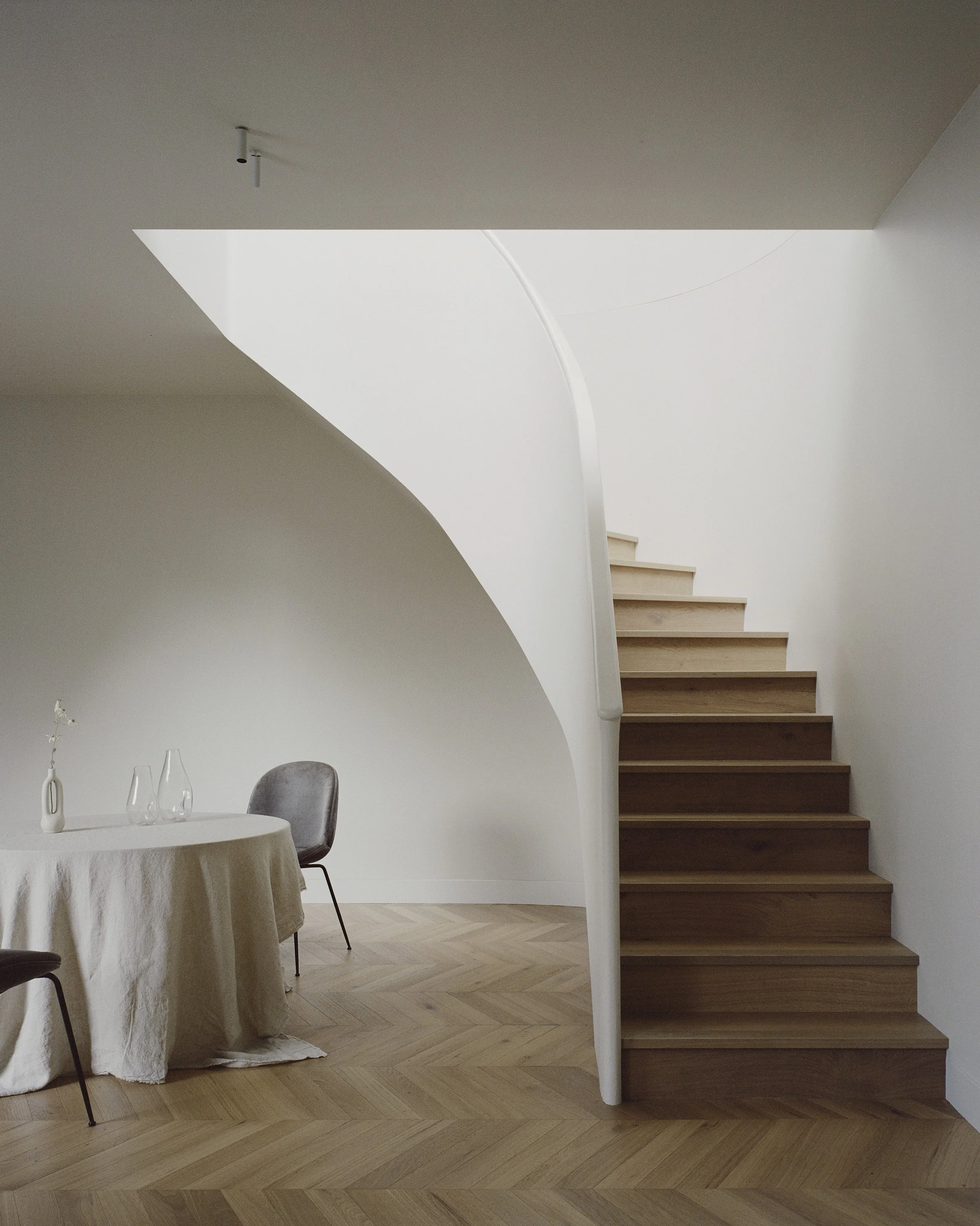 Inside, the narrow existing corridor draws you through the original cottage lured by the hidden garden beyond. An elegantly draped staircase sweeps between the floors, inviting visitors to ascend into the lofty, light filled living area above. The top room is surprisingly generous with high ceilings and north facing windows that also enjoy the hidden garden below. A second, secret internal courtyard above the stair also captures light and attention for the theatre of their lives, including Luna the cat.